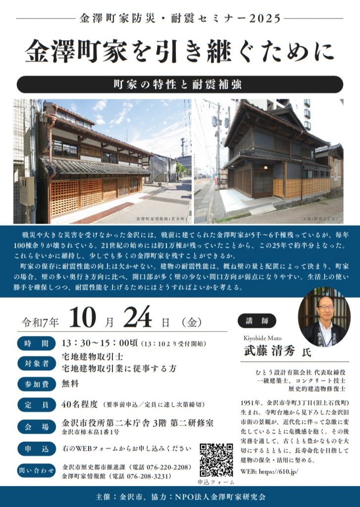金澤町家防災・耐震セミナーとして、宅地建物取引士および宅地建物取引業に従事する方を対象に、金澤町家を保全・活用していくための講座を開催いたします。