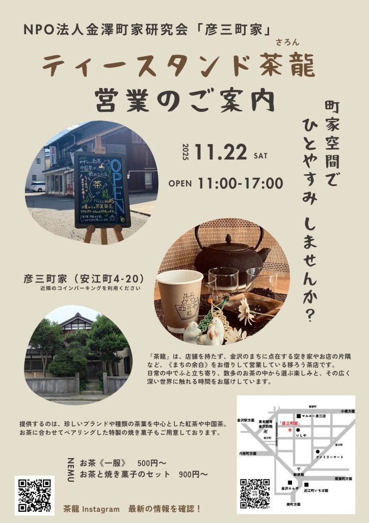 「茶龍」は、店舗を持たず、金沢のまちに点在する空き家やお店の片隅など、《まちの余白》をお借りして営業している移ろう茶店です。