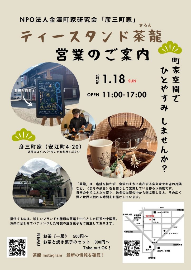 1月18日(日)彦三町家にて、紅茶と中国茶が楽しめる小さなティースタンド「茶龍(さろん)」を営業いたします。