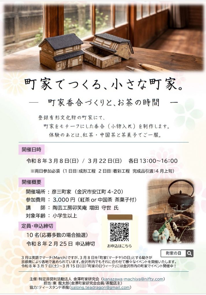 登録文化財の町家にて、町家型の香合(小物入れ)の製作体験を行います。