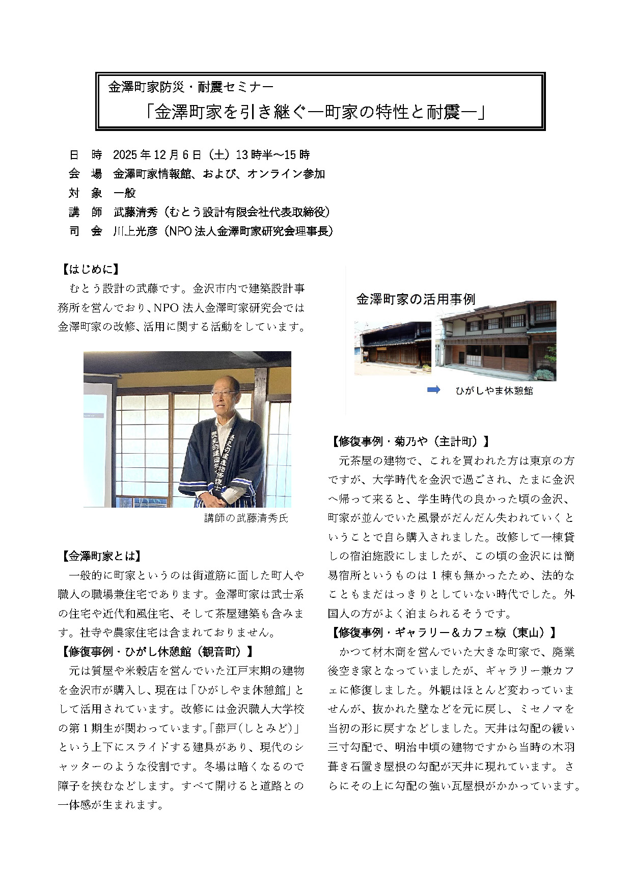 金澤町家防災・耐震セミナー「金澤町家を引き継ぐ―町家の特性と耐震―」 2025/12/06